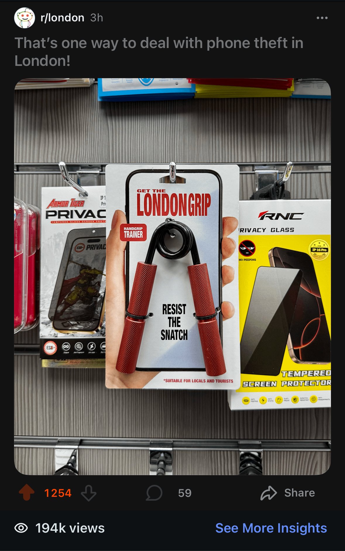 I repositioned hand grip strengtheners as a way to help Londoners avoid phone-snatchers pinching their phones. It blew up on Reddit for a few hours before being removed by an overzealous mod.